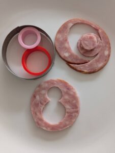 ②厚切りハムを大きさの違う丸い抜き型で抜き、両面焼いておきます。