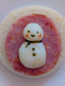 ⑤海苔で顔パーツ・マフラーを作り、ほっぺはケチャップをつけます。