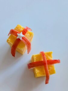 ⑥卵焼きは小さい四角にカットし、カニカマでリボンを作り、プレゼントにします。