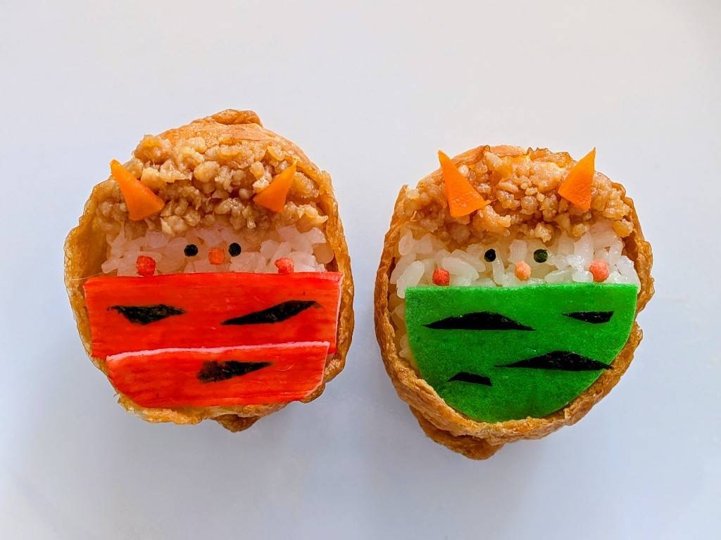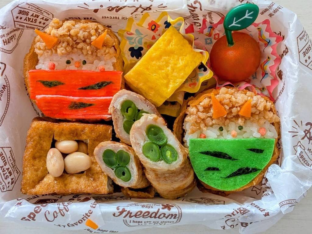 酢飯、味付けいなりあげ、ととしーと(緑)、カニカマ、鶏そぼろ、ぶぶあられ、海苔、マヨネーズ(接着用)、厚揚げ、大豆、人参、インゲンの肉巻き、ミニトマト、卵焼き