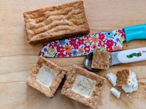 ⑦ 厚揚げの内側を四角く抜きマスを作ります。