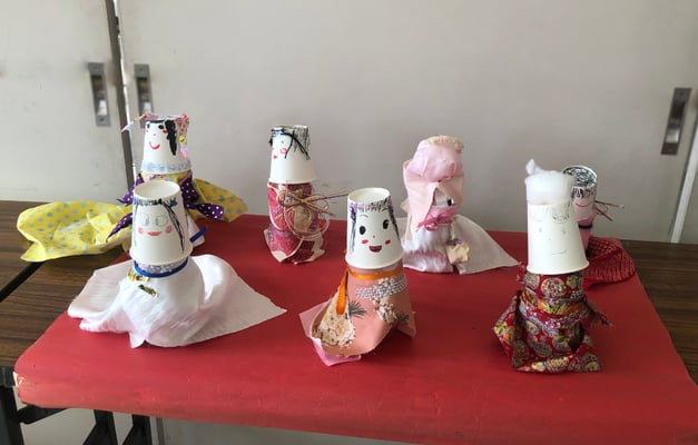 お顔は紙コップに書いて、瓶にかぶせました。布で髪飾りをつけた子もいました。