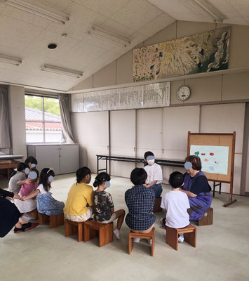 おねえさんに絵本「ここからおいしいよかんがするよ」を読み聞かせてもらいました。