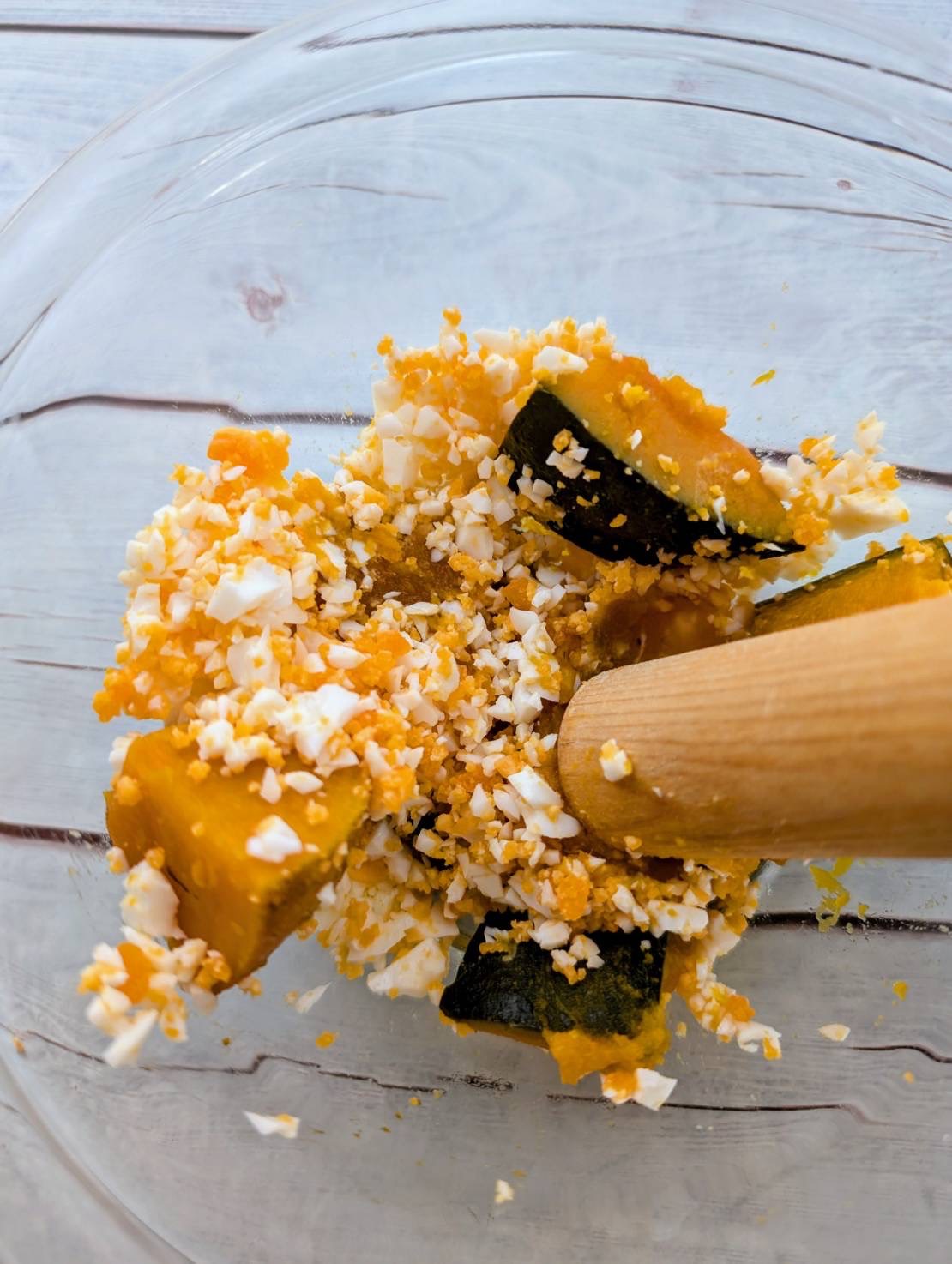 南瓜の煮物5個くらい(大きさにもよります)と、ゆで卵を潰します。マヨネーズと塩コショウで味を調えます。あればお好みのナッツを粗みじんにして、一緒にザックリ混ぜます。