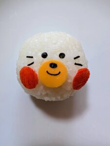 顔パーツは、カニカマ、チェダースライスチーズ、海苔を使い、接着はマヨネーズでします。
