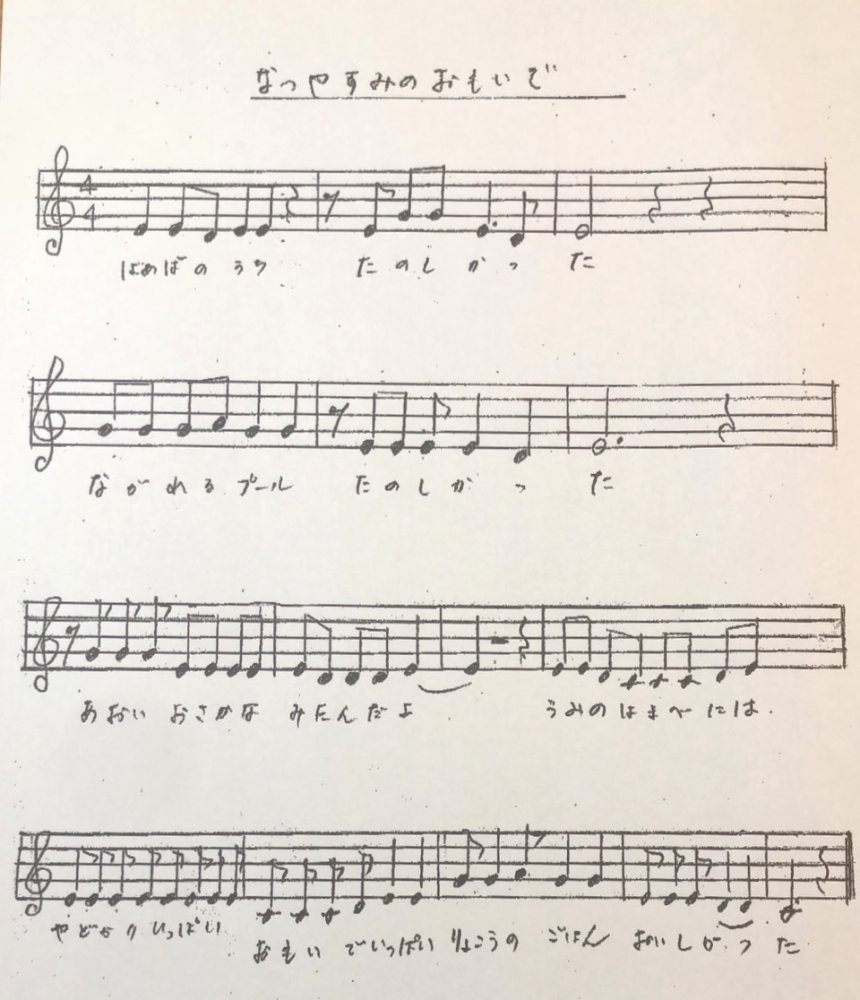 これらを歌詞にして、大人が曲をつけて「なつやすみのおもいで」という素敵な歌ができました。